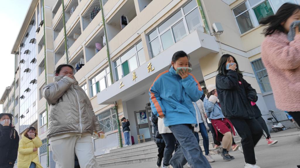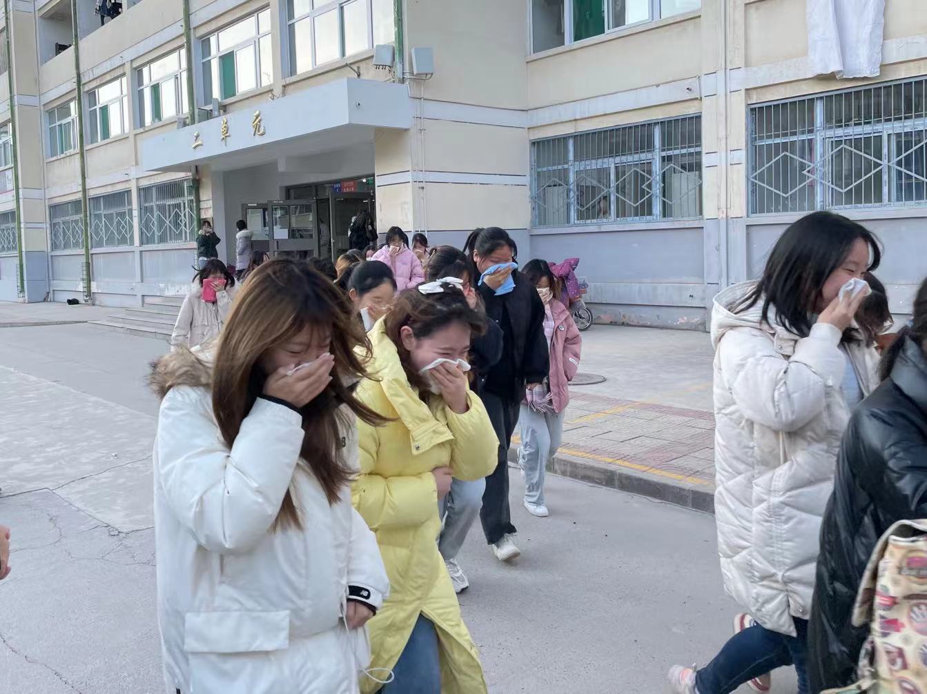 下午14点10分,伴随楼层疏散人员的呼喊与引导,学生们有序地从防火通道口有序撤离,只见他们一个个表情严肃,用毛巾捂住口鼻,紧张有序地疏散撤离到预定场地,并按班级排成方队,等候指示。