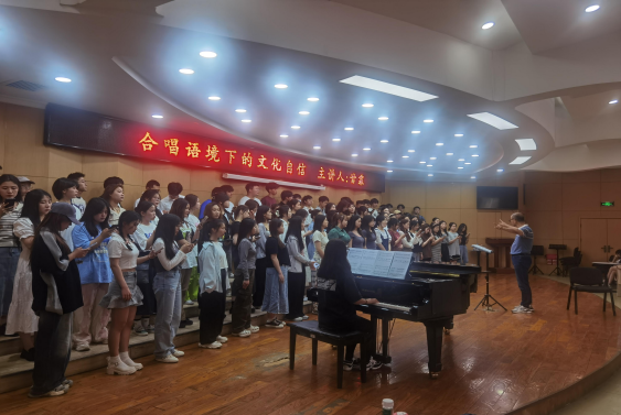 教授以《走过山川江河》为例,首先对合唱团成员进行了练声的 训练,避免大家在歌唱中对嗓子造成伤害以及保证达到好的歌唱效果。 其次,对歌曲进行了分析,让成员们在体会到歌曲内涵的基础上,唤 醒我们对祖国大好河山的自豪与骄傲,唱出属于我们的文化自信。