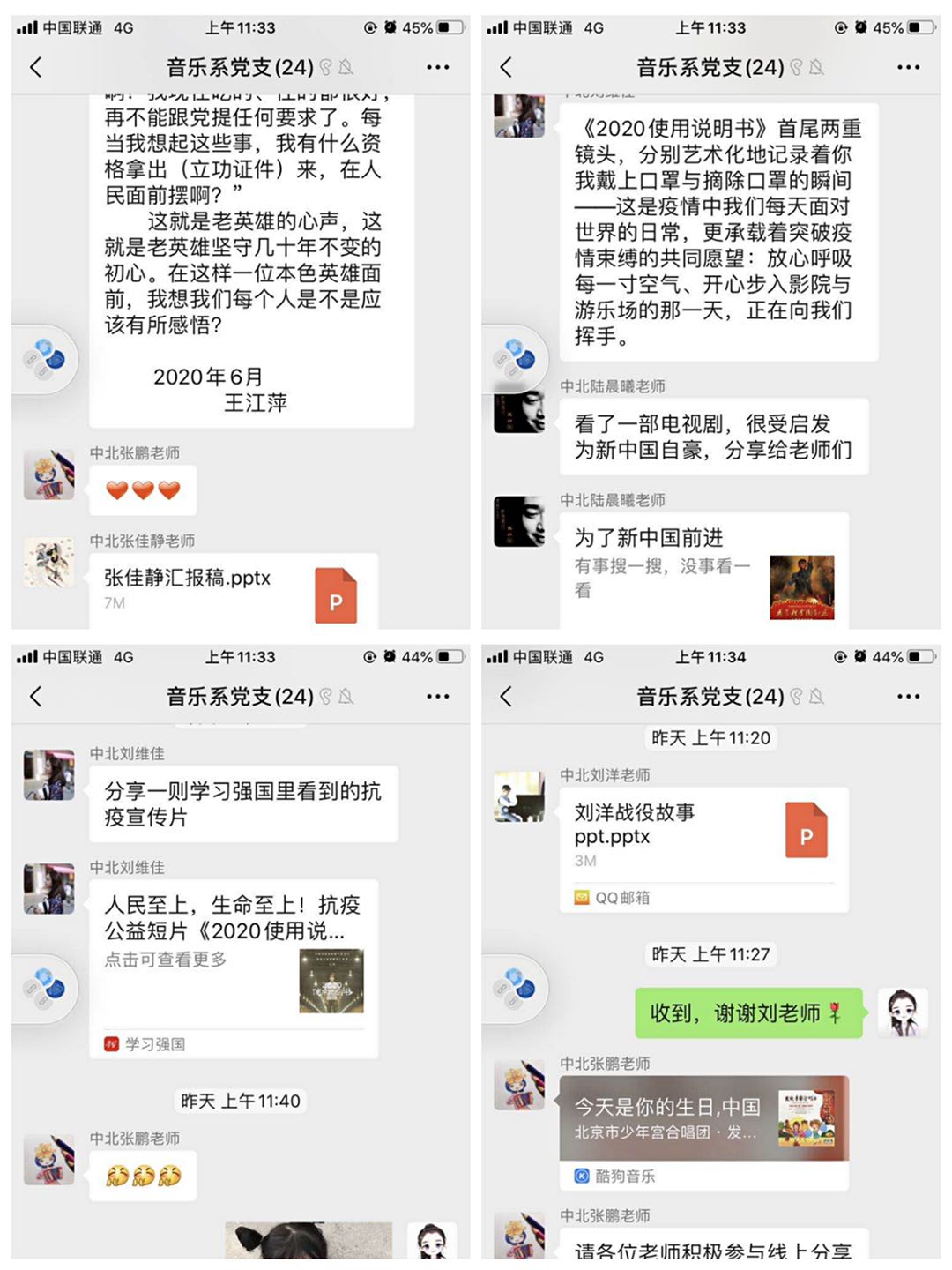 接着,支部成员结合个人情况讲述身边的抗疫故事。刘维佳老师介绍了自疫情以来艺术院学生党员在抗击疫情中的付出以及全体辅导员最先投入工作一线,不辞辛苦、克服困难,为积极有效稳定学生情绪,落实学生管理,实现疫情期间各项工作稳步推进做出了重要贡献。之后三位老师先后分享了抗疫英雄事迹、红色经典书籍。刘洋老师表示疫情当前,党员的先锋模范作用得到了最大范围发挥,广大党员服从服务于抗击疫情这个当前最大的大局,主动亮相、主动发声,以实际行动践行共产党人的初心和使命。王江萍老师说疫情期间,她感受到了党的政治领导力、战略决策力、贯彻执行力,疫情向好的形势也充分体现了社会主义的优越性,体现了党的领导力,身为党员感到无比光荣。张佳静老师讲到作为中国人,大难来临时,每一个人都在自己的岗位上,在平凡的生活中为中国抗疫战斗的胜利作出贡献。