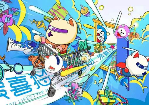 ①画面是一只三只爱喜猫和各种小商品从任意门中飞出来,代表着义乌就是任意门,这里有你想要的任何东西。②最大的那只爱喜猫是驾驶着购物车从任意门里满载而归。代表着这里的商品丰富且便宜,稍不注意就会满载而归。③整幅画面是喷溅式构图,喷溅出的正是各种小商品,寓意义乌商品丰富,已经多到装不下了。