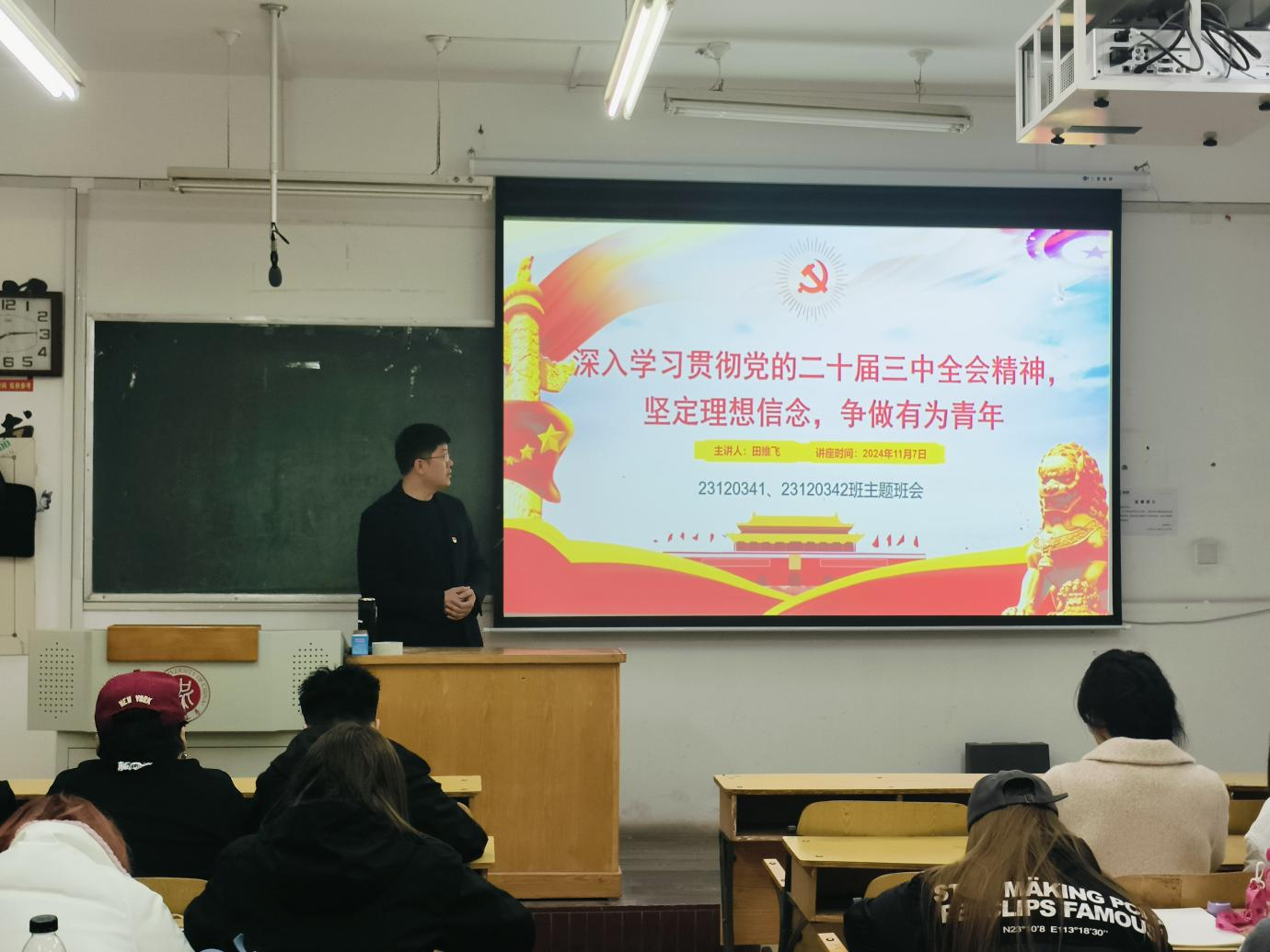 2024年11月7日下午,做爱视频 党委副书记田维飞为2312341、342班召开了一场别开生面的主题班会,主题为“深入学习贯彻党的二十届三中全会精神,坚定理想信念,争做有为青年”。