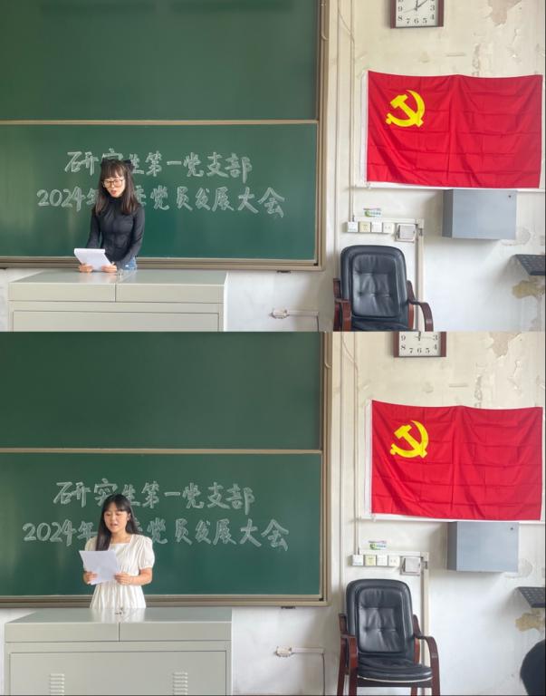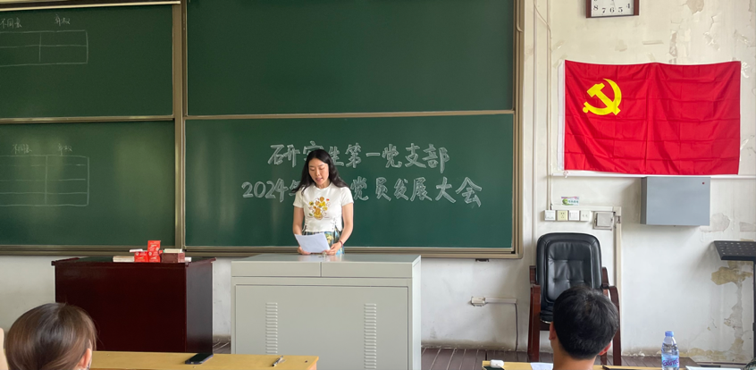 研究生第一党支部在12号楼三层本科生教室召开2024年春季党员发展大会。大会讨论2位预备党员贾泓琳、宋楠按期转为中共正式党员的问题。支部共有党员25名,应到25名,实到25名,未到0人。应到会有表决权的正式党员19名,实到会有表决权的正式党员19名。有表决权的正式党员到会人数超过应到会有表决权人数的半数,符合会议规定人数。