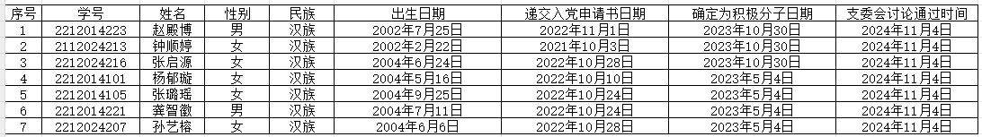 经党支部培养教育和考察,在听取党小组、培养人、党员和群众意见,积极分子量化考核的基础上,经支委会2024年11月4日讨论,拟确定张启源等7名同志为发展对象。