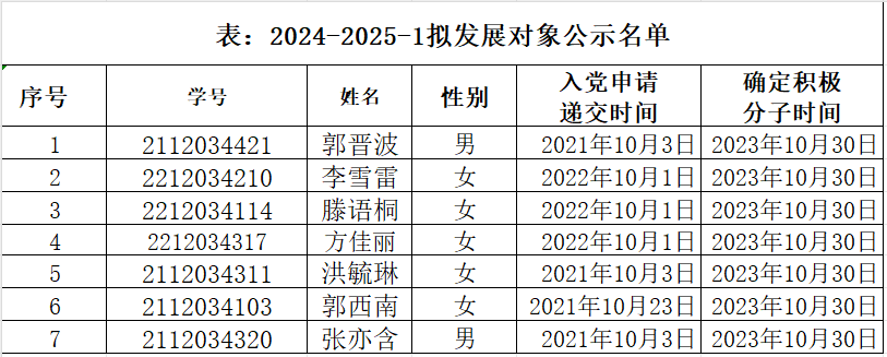 经党支部培养教育和考察,在听取党小组、培养人、党员和群众意见,积极分子量化考核的基础上,经支委会2024年11月4日讨论,拟确定郭晋波等7名同志为发展对象。