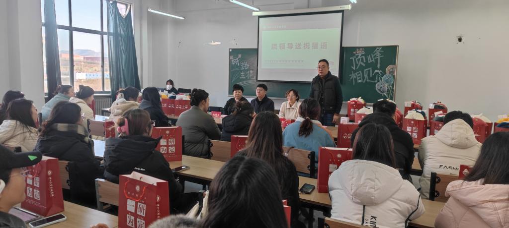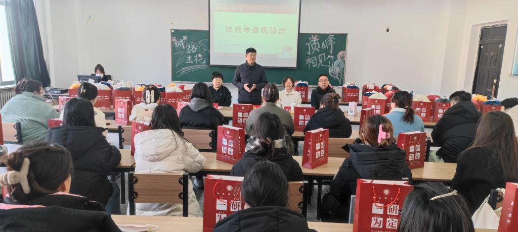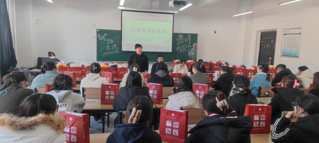 紧接着,院领导们依次送上真挚的祝福语。院党委副书记田维飞满怀热忱地祝大家:坚定信心,坚持到底;科学备考;加油冲刺;调整心态,轻松上阵。副院长李仁伟恳切地送上祝愿:星光不负赶路人,希望每一滴汗水都能换来每一份收获,也希望大家成长为自己想要成为的样子。杨博华副院长引用“无人扶我凌云志,我自踏雪至山巅。”诗句,转而温暖有力地说到:学习从来都是一个人的战斗,它是最难的,因为只有你一个人。也是最简单的,因为只要你一个人成功,这件事就成了。言罢,院领导一同将精心筹备的“考研大礼包” 递到同学们手中,并逐一加油打气。礼包沉甸甸,情谊更厚重。