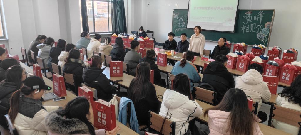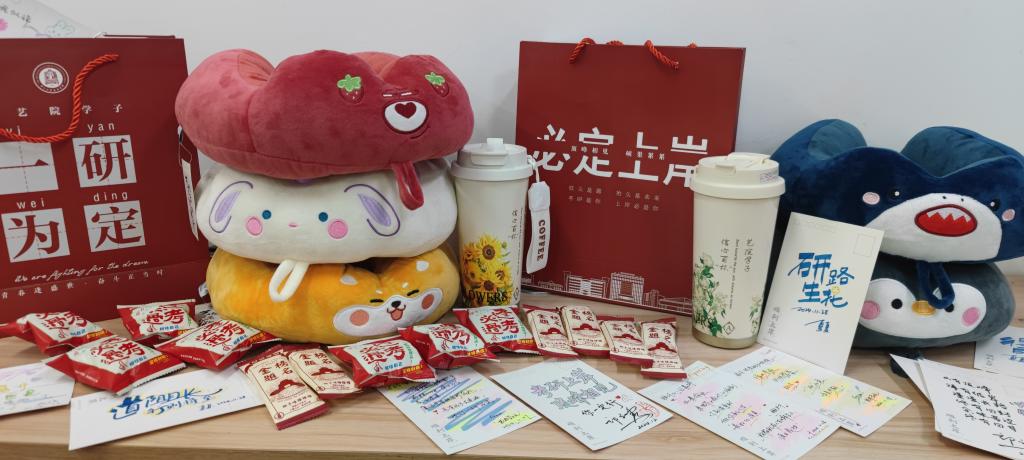 大会开场,气氛便被烘托得暖意融融。院党委书记郭云霞语重心长地说道:考研,是一场自我锤炼、自我升华的艰难征程。此间收获了人生当中最宝贵的财富“坚韧和毅力”。同时希望大家感恩父母的默默支持,感恩成长路上老师的陪伴,感恩辅导员的默默付出和他们精心准备的考研礼。学院相信你们一定是最棒的。她手中拿着寓意艺院学子“枕”的很行的U型枕,预祝大家埋头苦学的日子里,能随时拥有舒适的休憩;还有象征信心百“杯”、一路开挂的多饮杯,激励同学们时刻保持昂扬斗志,为梦想举杯;以及印着 “逢考必过” 字样的薯片小圆饼、寓意金榜题名的椰子味棒棒糖,满含对同学们的美好期许。更令人动容的是老师们亲手书写的祝福卡片,一笔一划间尽是深情叮嘱。