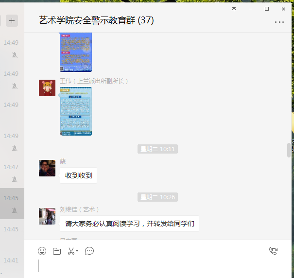安全警示教育群中上兰派出所副所长王伟警官为大家提供的典型电信诈骗案例,切实起到警示教育的作用;其次要和班级同学强调疫情期间要注意自己的网络言论,要做到不造谣、不传谣、不信谣;再次一定要落实班级同学的每日健康状况日报表,及时了解每一个同学的身心健康情况,有问题一定要第一时间向班主任报告;最后吕老师安排各班长一定要在近期内开展关于安全教育主题班会,做好上传下达,提高同学们安全防范能力。