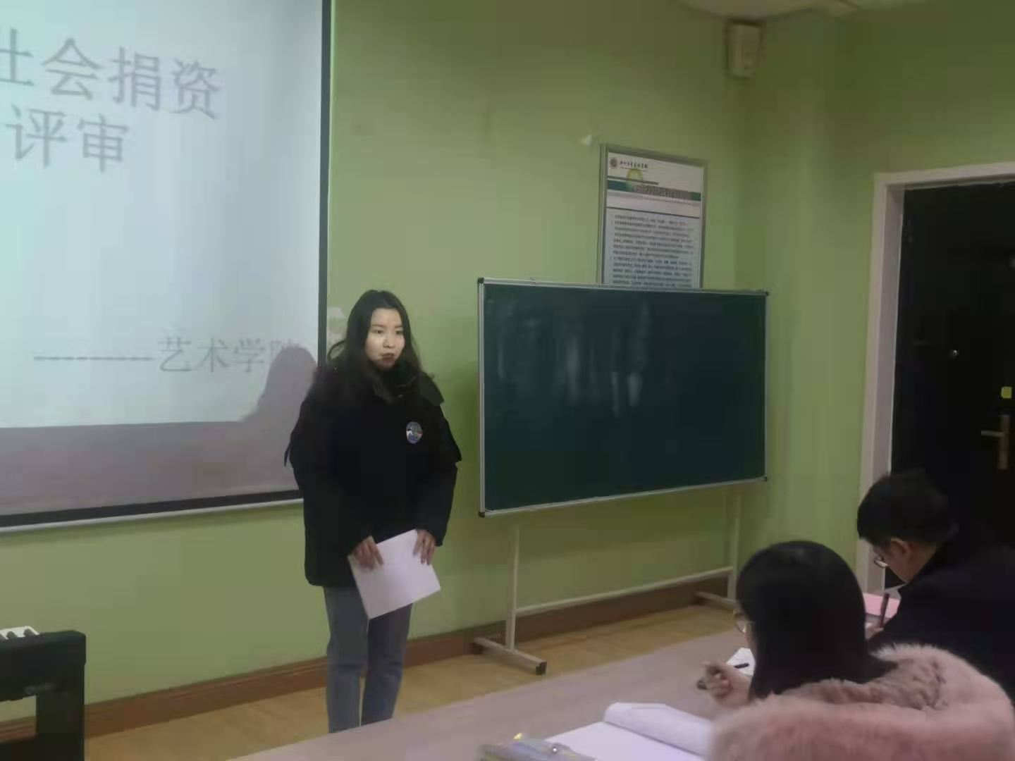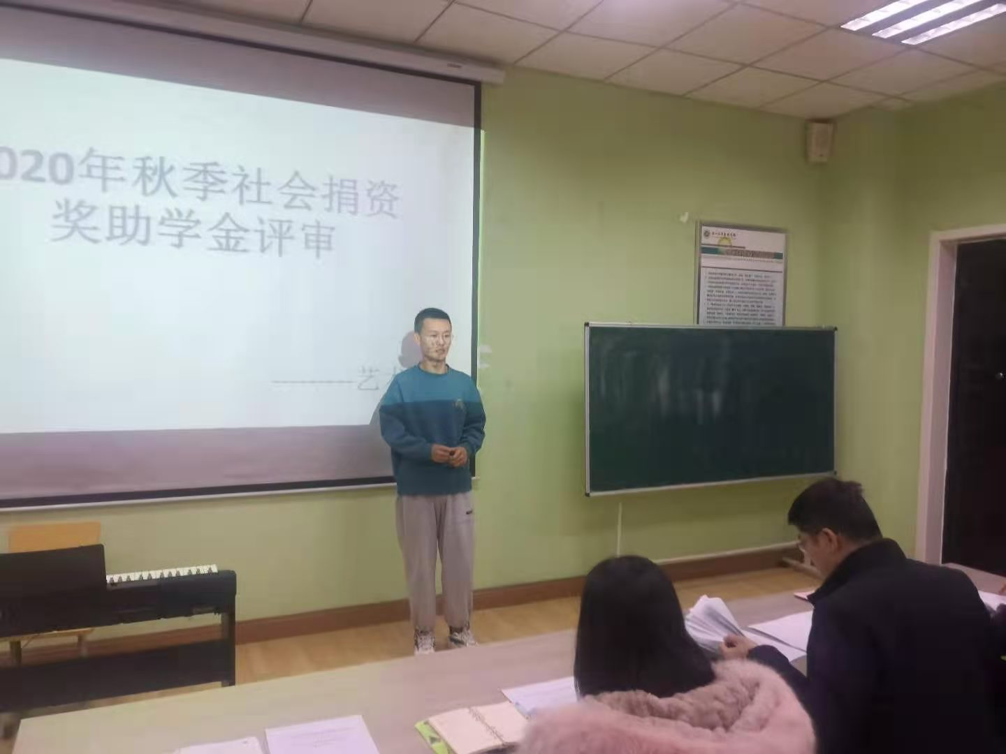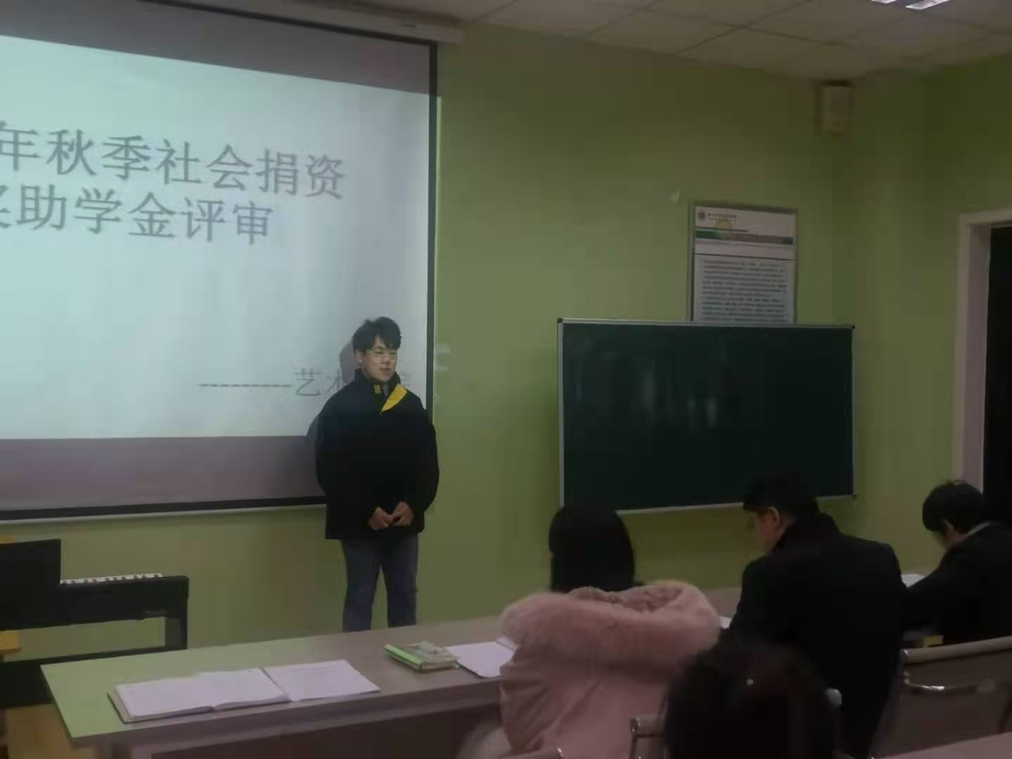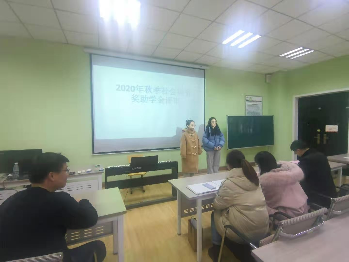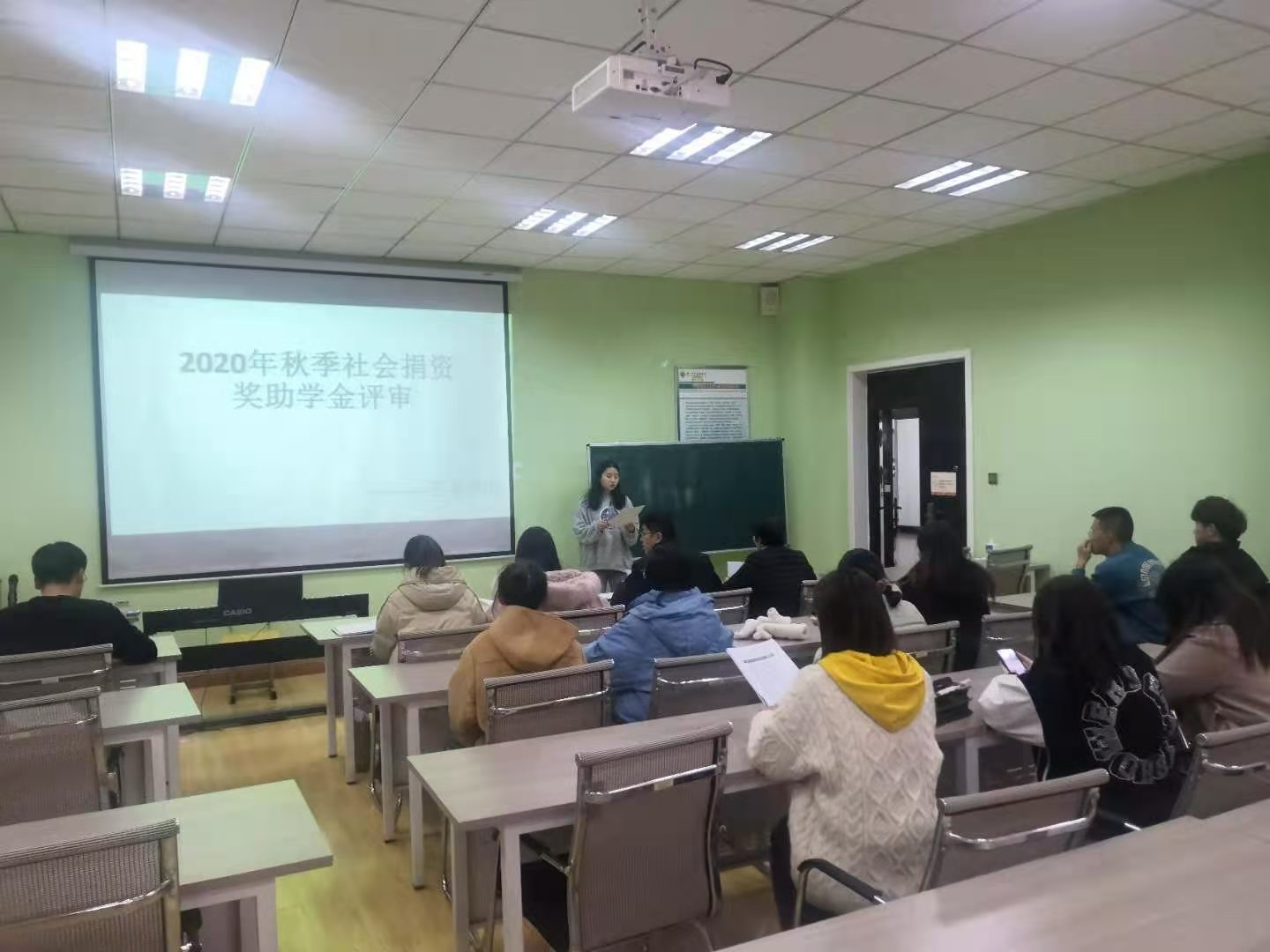 2020年秋季社会捐资奖助学金答辩评审会在9号楼526研究生教室召开,参加会议的是学生工作组党委副书记田维飞,学生科科长夏志丽、学生科副科长吕超,学院辅导员刘维佳、王帅出席评审会并担任评委。经前期个人申请、班级评议和学院初审环节,共有16名同学进入终评。评审会由辅导员王帅主持。