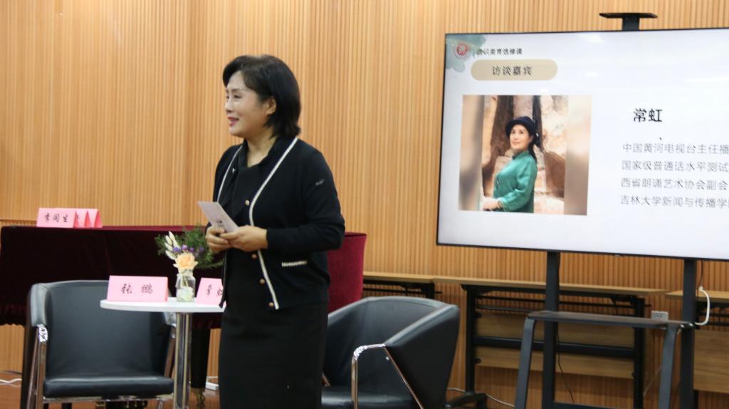 副教授张鹏主持,邀请国家一级演员张晶老师、中国黄河电视台主任播音员常虹老师、山西省朗诵艺术协会副会长兼秘书长李同生老师和山西老兵艺术团团长牛太平老师四位专家参与。各位专家与参会的大学生朋友们分享了朗读的感受、经验与技巧,现场演绎了名篇佳作的朗读,使同学们感受到声情并茂的艺术气息,受到了强烈的艺术熏陶。