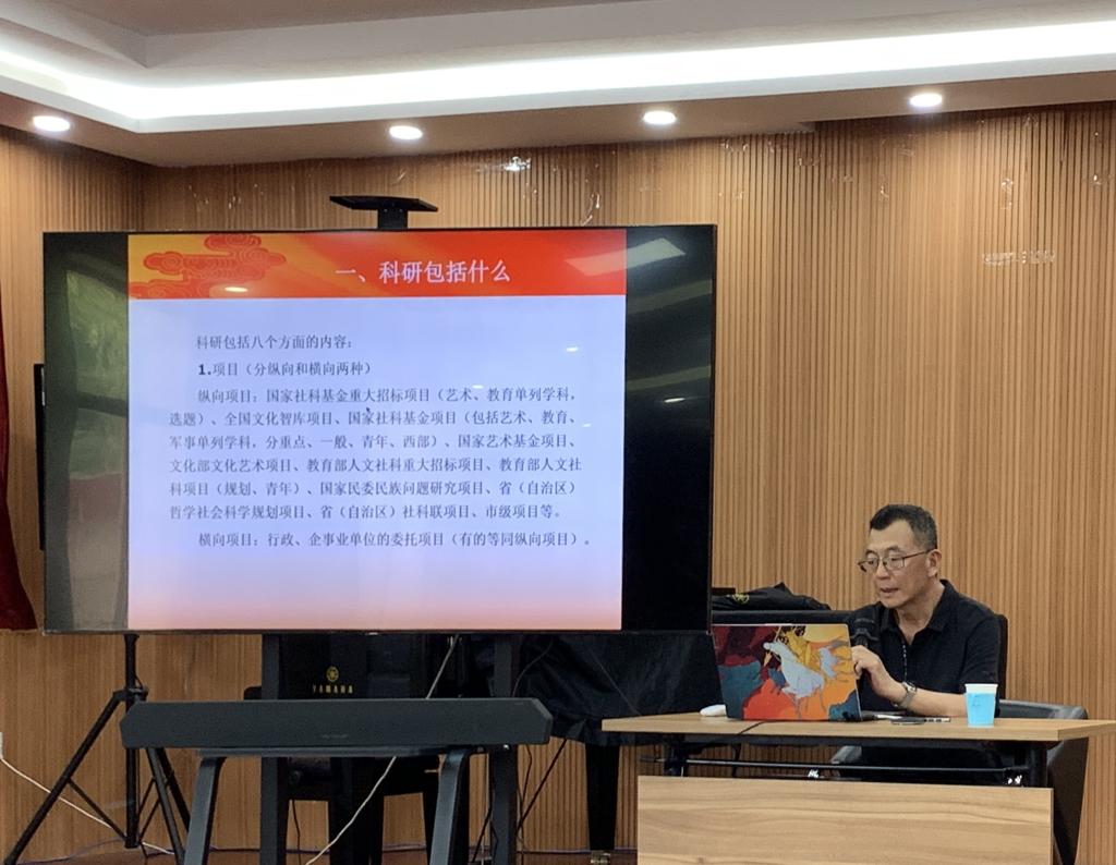 讲座中,张教授不仅详细解析了艺术类专业科学研究的定位、方向选择、方法运用等核心问题,还强调了美育在其中的重要作用。他提出,艺术类专业科学研究应紧密结合时代需求,关注社会热点问题,同时注重学科交叉与融合,不断拓展研究领域和深度。在这个过程中,美育的理念应贯穿始终,通过艺术的力量传递美、发现美、创造美,从而培养学生的审美情趣和创新能力。