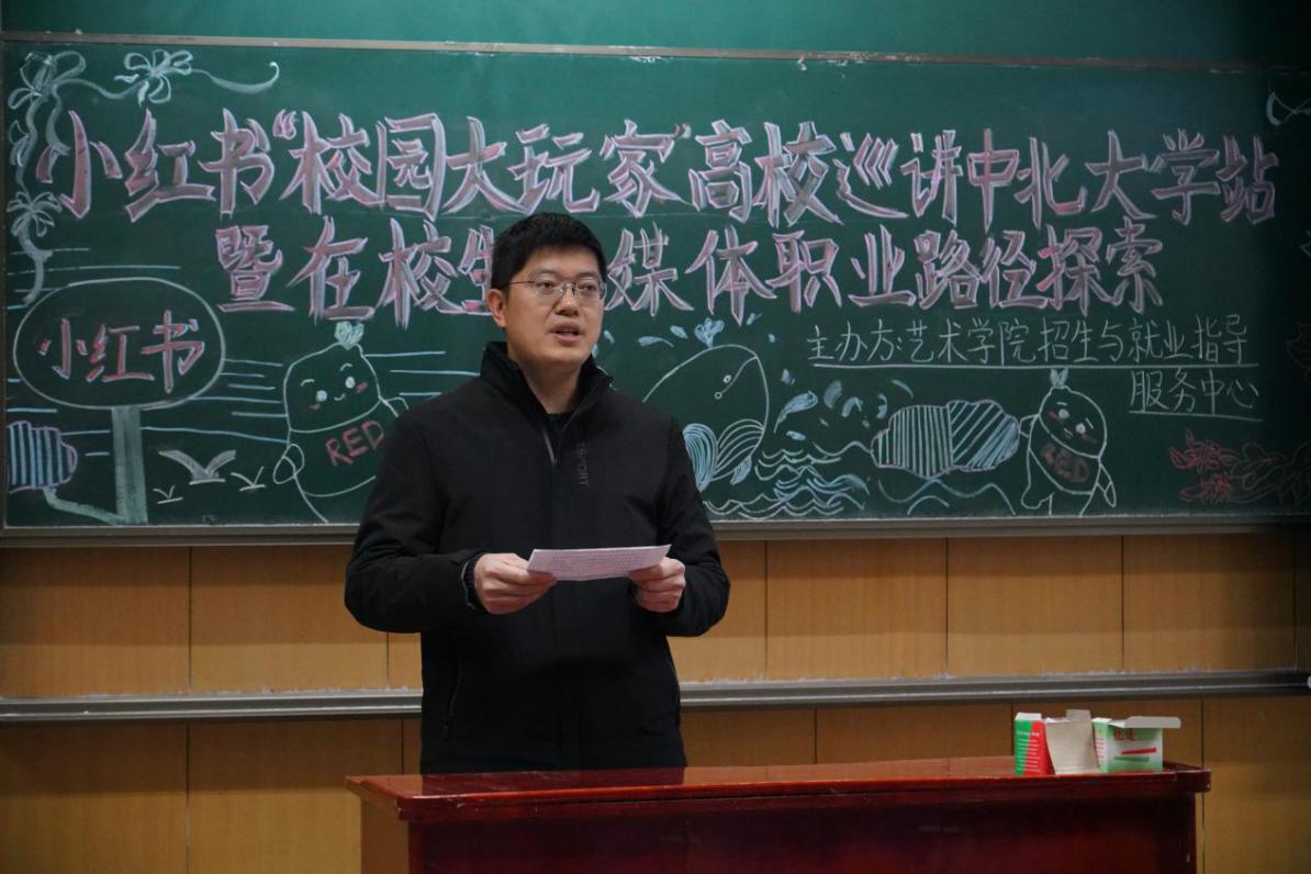 党委副书记田维飞上台致辞,表达了对本次宣讲会嘉宾的热烈欢迎,期望借助本次讲座新媒体可以将他们的兴趣、专业等实现实时分享和无缝对接,帮助网络原住民的00后大学生走上新媒体职业道路。